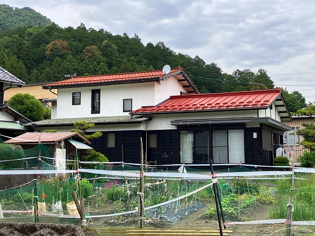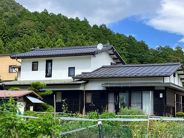 離れの屋根(現状セメント瓦)の塗装が剥がれだし、下屋の瓦棒屋根とあわせて提案してほしいとのこと。